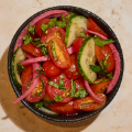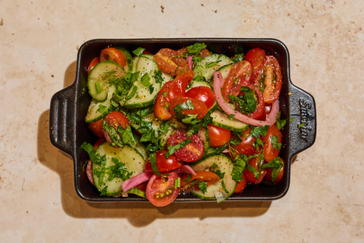 Grape Tomatoes, Sliced Cucumbers, Pickled Red Onion, Fresh Herbs, EVOO, Red Wine Vinegar, Kosher Salt, Black Pepper