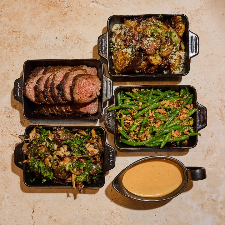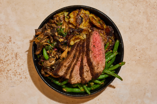Grass-Fed Steak, Blue Oyster Mushroom Mix, Crispy Smashed Potatoes, Green Beans with Crispy Shallots, Spicy Miso Aioli (un)dressing | *Contains Dairy | *Contains Soy