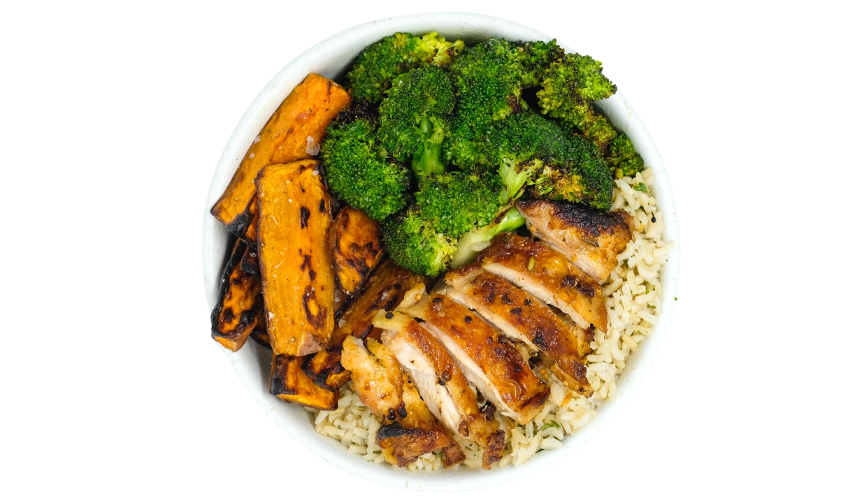 Charred Chicken, Roasted Sweet Potatoes, Charred Broccoli with Lemon & Garlic, Brown Rice with Parsley, Garlic Aioli (un)dressing | *Contains Soy