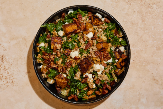Winter Citrus Farro, Sweet Potatoes, Kale, (remove Arugula) Candied Pecans, Crispy Shallots, Goat Cheese, Golden Raisin, White Balsamic Vinaigrette |*Contains Wheat| *Contains Dairy|*Contains Pecans | 530 CAL