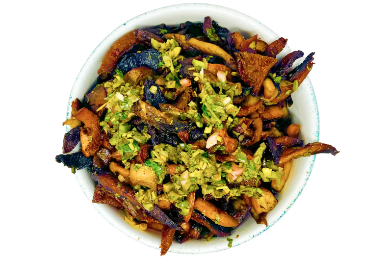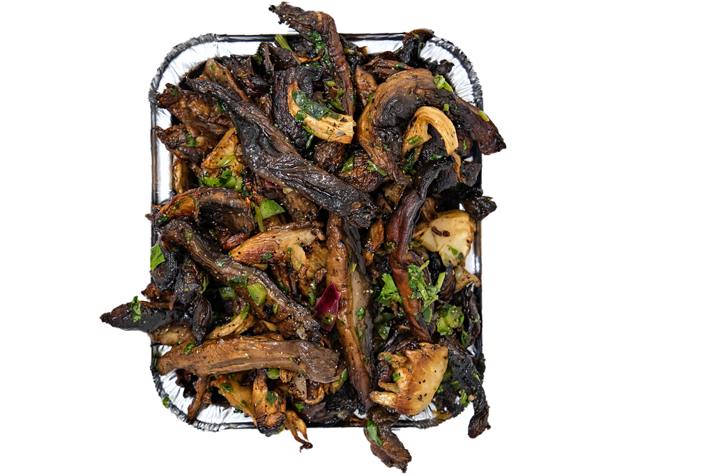 Roasted Blue Oyster & Portobello Mushroom Mix with Extra Virgin Olive Oil, Sea Salt & Pepper, Cilantro Chimichurri (Jalapeno, Garlic, Red Onion, Cilantro, Lime, Salt, EVOO).