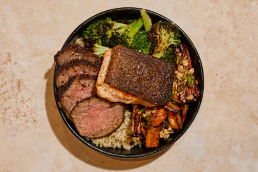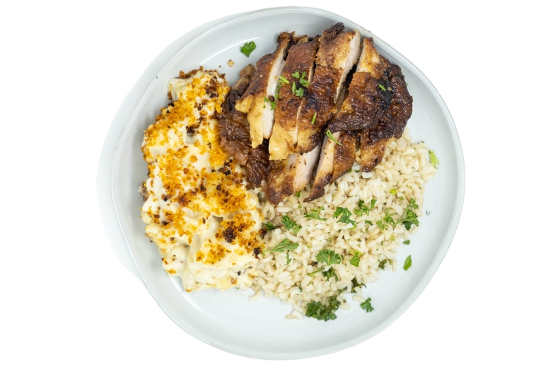 Rosemary Roasted Chicken Breast, Grass-Fed Steak, Charred Broccoli with Lemon & Garlic, Roasted Sweet Potatoes, Brown Rice with Parsley, Garlic Aioli (un)dressing | *Contains Soy
