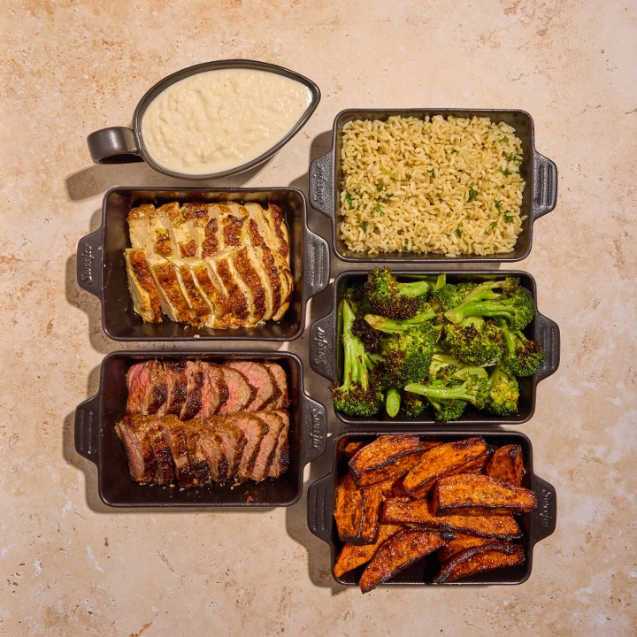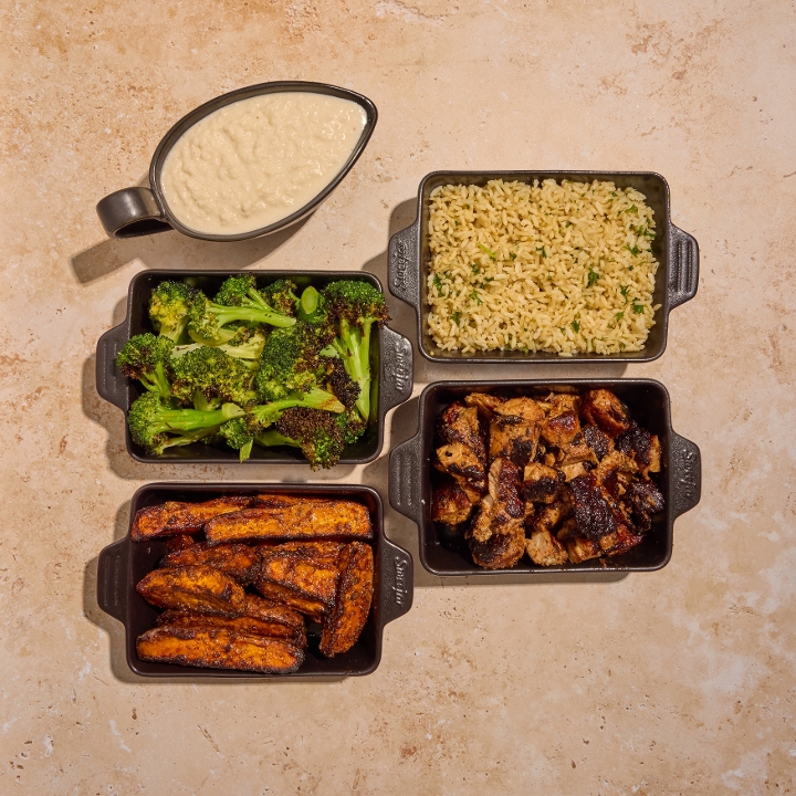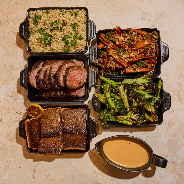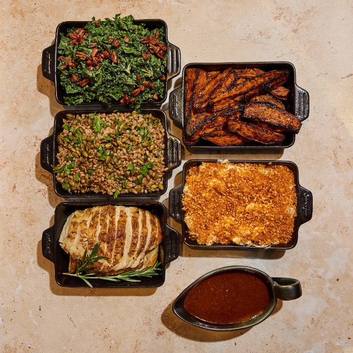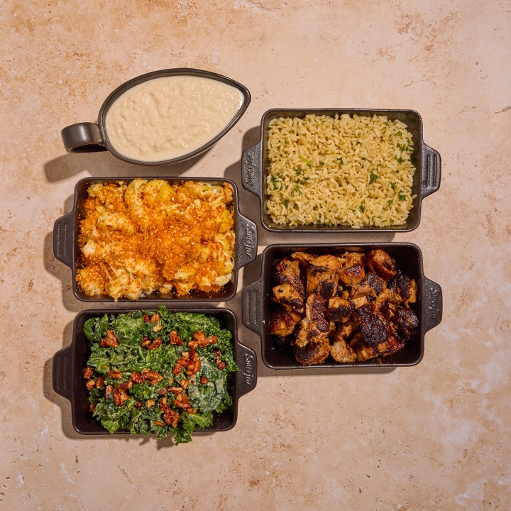 Feed the whole fa(r)m. Family style portions of one grain or green, two sides, and one protein. Serves 4-5.