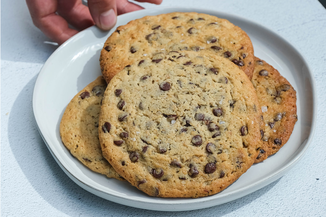 All Purpose Flour, Baking Soda, Baking Powder, Unsalted Butter, Dark Brown Sugar, Granulated Sugar, Eggs, Vanilla Extract, Espresso Powder, Chocolate Chips, Dark Chocolate Chunks, Maldon Salt