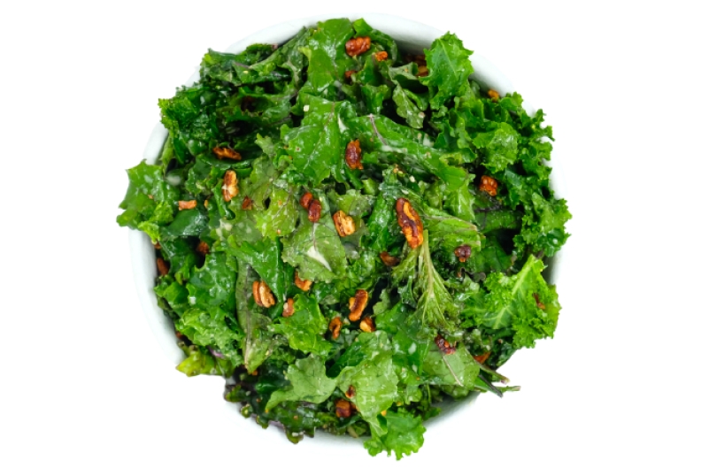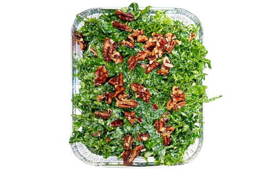 Tuscan Kale, Lemon Juice, Nutritional Yeast, Candied Pecans (Agave, Kosher Salt, Aleppo Chili Flakes), Caesar dressing (Garlic Aioli, Avocado Oil, Olive Oil, Cayenne, Dry Mustard, Apple Cider Vinegar, Garlic, Kosher Salt, Agave, Water, Tofu, Lemon Juice, Tahini, Black Pepper)