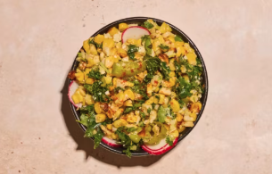 Local Sweet Corn, Napa Cabbage, Tuscan Kale, Red Radish, Pickled Shishito Peppers, Fresh Lime Juice, Cotija Cheese, Cilantro, Chili Flakes, Garlic Vegan Mayo.