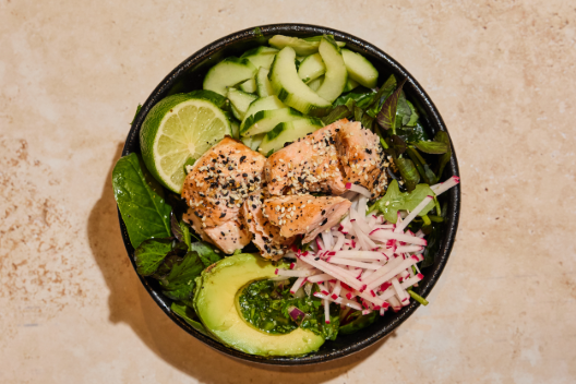 Faroe Island Samon, Sesame Crunch, Chimi-Lime Avocado, Farm Greens, Chives, Cliantro, Cucumber, Radish, Lime Wedge, Spicy Miso Aioli |*Contains Soy | *Contains Sesame | *Contains Fish | 586 CAL