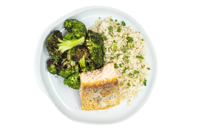 Half portions of Brown Rice, Broccoli and Faroe Island Salmon.