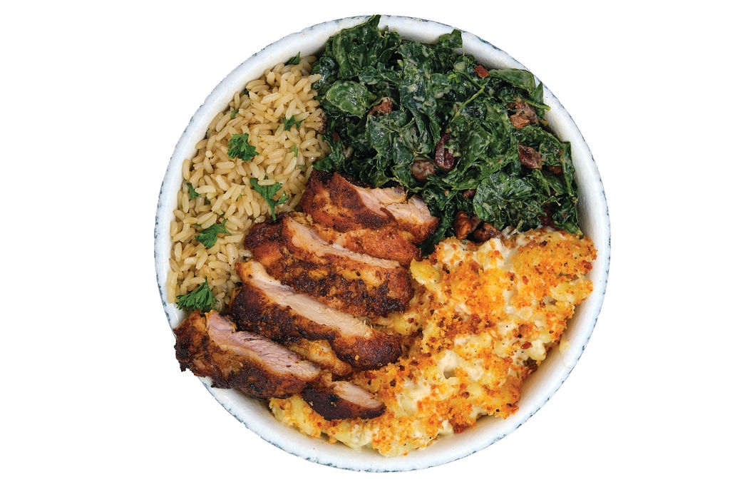 Charred Chicken, Mac & Cheese, Pecan Kale Caesar, Brown Rice with Parsley, Garlic Aioli (un)dressing | *Contains Wheat | *Contains Dairy | *Contains Pecans | *Contains Soy | 965 CAL