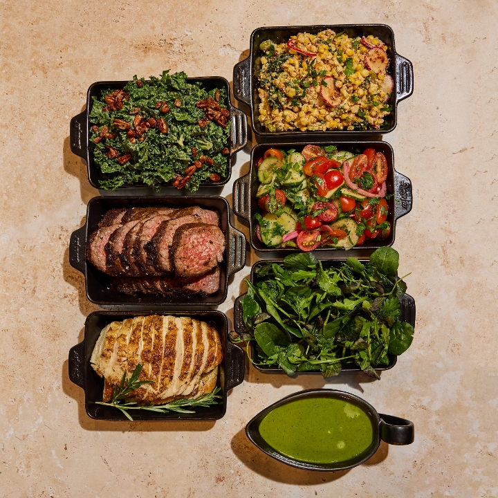 Grass-fed Steak, Rosemary Roasted Chicken Breast, Street Cart Corn, Tomato & Cucumber Salad, ½ Pecan Kale Caesar, ½ Farm Greens, Basil Pesto (un)dressing | *Contains Soy | *Contains Dairy | *Contains Pecans