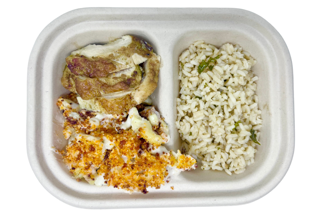 Half portions of Brown Rice, Mac & Cheese and Charred Chicken. [Contains wheat, dairy]