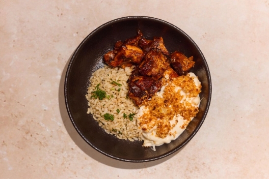Charred Chicken Thigh, Roasted Sweet Potatoes, Charred Broccoli with Lemon & Garlic, Brown Rice with Parsley, Garlic Aioli (un)dressing | *Contains Soy