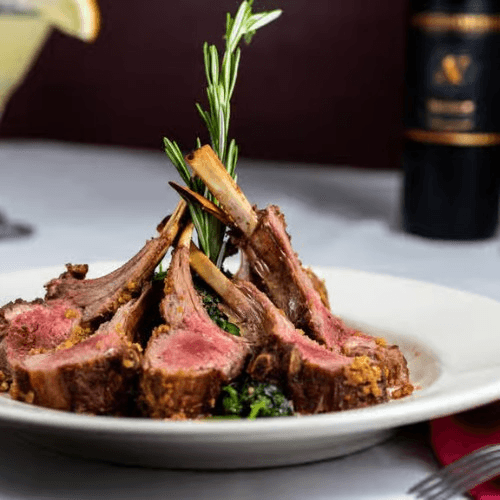 Roasted lamb rack with garlic, rosemary sauce and topped with dijon mustard and bread crumbs