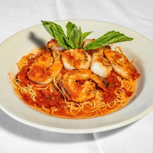 Angel hair with shrimp and scallops, mushrooms in aurora or red sauce
